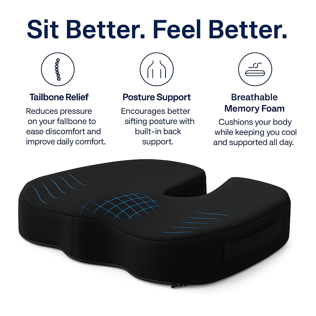 The PosturePro Comfort Seat features a doctor-recommended ergonomic cutout and dual-density memory foam that cushions your body, relieves tailbone pressure, and supports healthy posture—turning any chair into a pain-free, all-day comfort zone.