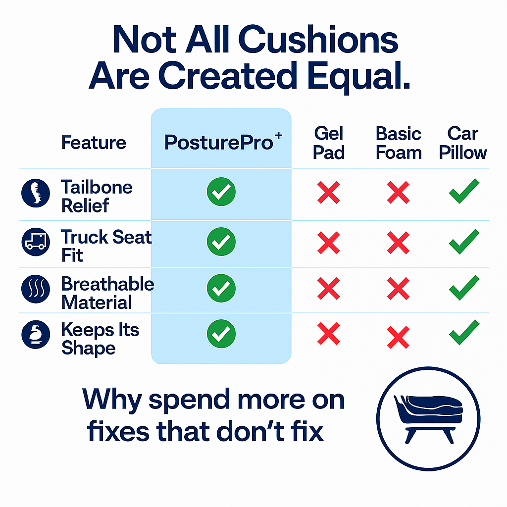 Sitting for hours shouldn't mean back pain, numb legs, or stiff hips. The PosturePro Comfort Seat adds instant support and relief — wherever you sit.